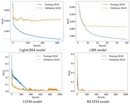 The hyperparameter values appertaining to each of the four algorithms are systematically enumerated in Table 6. Additionally, to mitigate the risk of overfitting, the training process for each of the four models was monitored by plotting the mean absolute error (MAE) against the epochs shown in Figure 9. Early stopping was implemented to ensure that each model ceased training at the point of optimal generalization.