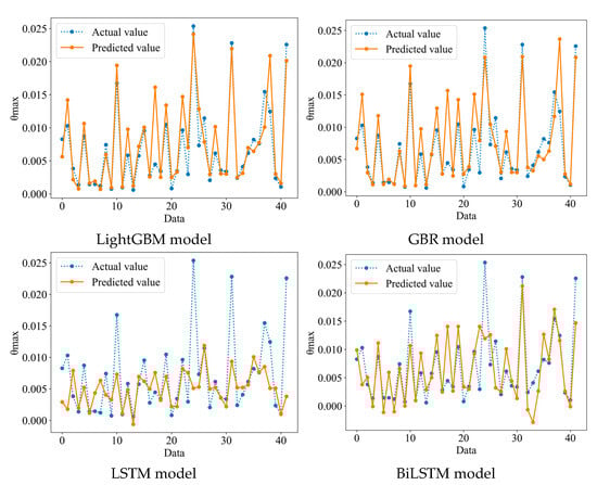 Therefore, these four ML models are used to predict the maximum inter-story drift , and the mean square error (MSE), root mean square error (RMSE), and mean absolute error (MAE) are used to evaluate the prediction results of the model. The specific values are shown in Table 7, while the images of the actual value and the predicted value are drawn in Figure 10.