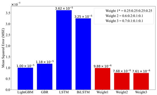 Figure 11 illustrates the comparison of MSE values for a range of weight configurations within the ensemble fusion model, juxtaposed against the MSE values derived from the four individual ML models previously discussed. It shows that the fusion model’s accuracy is higher than the four ML models above and analysis reveals that the model with a weight distribution of 0.7 for LightGBM, 0.1 for GBR, 0.1 for LSTM, and 0.1 for BiLSTM demonstrates the highest accuracy.