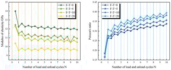 3.2. Elastic Modulus (E) and Poisson’s Ratio (μ) during Cyclic Loading and Unloading