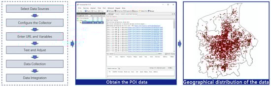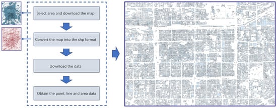 - POI data: POI data were obtained through the LocoySpider collector. The LocoySpider collector was employed to retrieve data from various websites, such as Soufun, Lianjia, 58TongCheng, and Anjuke. Taking Lianjia as an example, by identifying the web structure and entering the included URL (uniform resource locator) and variables during website acquisition, the URL was tested, and data were obtained. In this way, POI data such as residential area, number of households, latitude and longitude, building age, and building structure can be obtained. Building spatialization information was acquired based on OSM data (Figure 4).