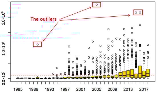 - Mathematical model check: The boxplot option in the R language model was adopted to evaluate the building-stock data of each residential area in Xi’an from 1990 to 2020. Boxplots (box–whisker plots) are generally used to intuitively determine whether data exhibit symmetry and to obtain the data dispersion degree. The time and material stock are defined as the horizontal and vertical coordinates, and then boxplots of the obtained residential stock data are obtained. Residential areas occurring far above the average are denoted as outliers, which need to be further assessed by locating their position using the Baidu map. Then, the total building stock is recalculated and compared to the crawled data. The ratio of the corrected data to the total data is considered when evaluating the accuracy of the data and determining whether the data can be used. The total number of abnormal data points obtained was 215 (Figure 5).