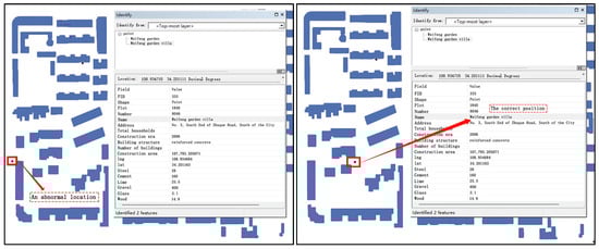 - Spatial check and calculation: Accurate spatial location plays an important role in analyzing the spatial development characteristics of residential material stock. As mentioned above, the building contour data and POI point data were integrated to compile a high-resolution dataset with spatial dimensions. The Gaode map was used to check the point data and building contours and to accurately check the spatial position of the POI. As shown in Figure 6, the position of the “Weifeng garden villa” is in an abnormal location, and the spatial check returns it to the correct position. After the spatial verification of the obtained data, 215 incorrect data points were found; therefore, the data error is less than 5%.