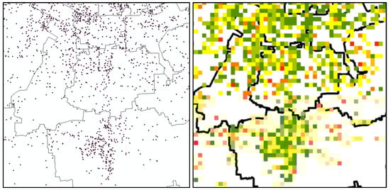 - Building contour data: Building contour data were obtained through OSM, which was founded by Steve Kester. OSM data mainly include the building contour area and the height, land area, roads, subways, etc. This database has been proven to be accurate and is widely applied in urban planning. A total of 139,874 valid surface data points of Xi’an building data were obtained through OSM (Figure 3).
