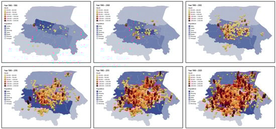 - Population and economic data: Population and economic scales determine the growth trend of urban development and building material stock. In this study, a field survey of the seven districts was conducted, and the registered residence population and permanent population, the completed housing area, and the data of various materials and GDP were collected for approximately 52 communities in Xi’an from 1990 to 2020.