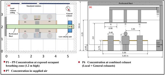The measurement process started by adjusting the total supply airflow rate and exhaust flow rates according to heat gains and air conditioning requirements. Each operational local exhaust flow was set to 10 L/s. The flow rate of the general exhaust varied depending on the experimental scenario. A multifunction meter (TSI, Aachen, Germany, TC9650) equipped with a hot wire anemometer probe (TSI, Aachen, Germany, TC966) was used for velocity measurements at the exhaust points. A large rectangular volume flow hood was then employed to calculate volume flow from velocity measurements. This flow measurement process maintained the overall balance of the system with minimum disturbance. The adjustable damper installed at each exhaust point was then used to adjust the required exhaust flow. A smoke test was conducted to visualize and ensure proper air movement and functionality of the exhaust points. Then, tracer gas dosing was initiated after the indoor airflow distribution and room conditions had reached steady-state conditions, a process that typically took about 1 h. Then, a continuous measurement of tracer gas concentration at all measuring locations P1 to P7 (Figure 1) was conducted throughout the test.