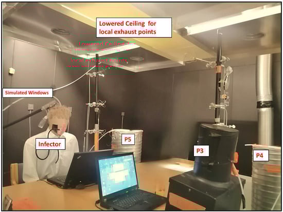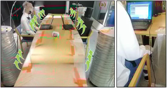 A lowered ceiling with six local exhaust units, each corresponding to a workstation, was installed. These exhaust units were merged seamlessly, forming a panel with no cracks between them. Two laptops were also present at the workstations, and light bulbs were installed above the local exhaust ceiling. The local exhaust false ceiling was metallic with some transparent glass sections that allowed light from the bulb to reach the occupied zone. Solar heat gain through windows was simulated using heated panels on one of the walls (Figure 2) where the surface temperature could be controlled. An electric heating foil (5.0 m × 1.0 m) was located under the workstations to simulate the direct solar radiation on the floor.