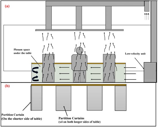 In addition to the conventional mixing and displacement ventilation, this study also examines the combined mitigating effect of local exhaust systems and a table plenum design in conjunction with the displacement air distribution method. The displacement unit was positioned adjacent to the working table, which supplied air beneath the table. To enhance its effectiveness, the table plenum settings, as depicted in Figure 3, were implemented by adding partition curtains (walls) to enclose the space under the table with openings near the occupants.