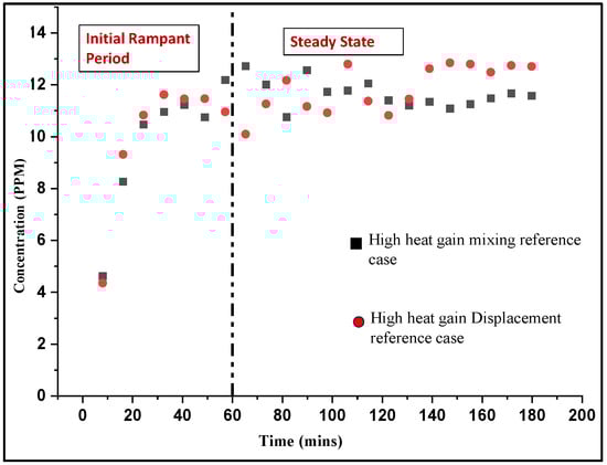 Two indices, and , used for the evaluation of measurements, are deemed valid when the contaminant concentrations in the indoor environment attain a steady state. For this investigation, a steady state is assumed when the contaminant concentration in the combined exhaust stabilized during the three-hour tests. One of the cases, as depicted in Figure 5, shows how the concentration stabilizes in the last two hours after initially rising for an hour following the start of contaminant injection at a time of 0 min.