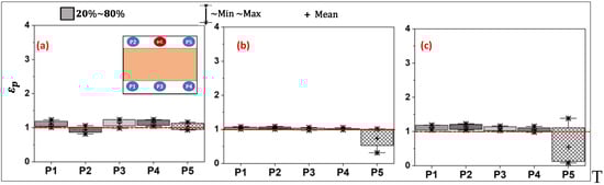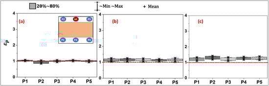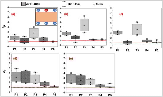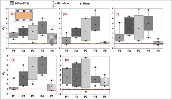 The local air quality index measures the effectiveness of ventilation systems in removing contaminants from the immediate vicinity of measurement points, i.e., the simulated individuals. Box plots are used to summarize the variation in the in the breathing zones of occupants at locations P1 to P5. The box indicates the primary data range between the 20th and 80th percentiles. The whiskers extending from the box show the dataset’s minimum and maximum values. Also, a red dotted line is consistently used to signify a critical threshold, i.e., = 1 (same contaminant concentration at combined exhaust and measurement point). When the value of falls below this line ( < 1), it indicates that the pollutant concentration at the specific measurement point is higher compared to the concentration in the exhaust duct. In other words, poor air quality conditions occur when < 1.
