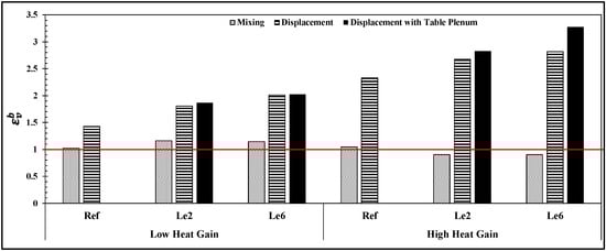 The overall effect of local exhausts in the breathing zone of an occupied zone is estimated using and presented in Figure 10. A red line at = 1 signifies complete mixing of airborne contaminants within the breathing zone of occupants. For mixing systems with low heat gains, the introduction of 2 operational local exhausts increased to 1.25 which is about 11% higher as compared to the respective reference case. A nearly similar effect was seen in the case of six local exhausts. However, with the displacement system at low heat gain, the value approached 1.7 for two operational local exhausts representing an increase of approximately 15% compared to its reference case. This value further increased to 2 with 6 operational local exhausts, marking a 22% increase in ventilation effectiveness for the breathing zone. The table plenum further enhanced displacement air distribution by increasing by about 5% compared to scenarios where it was not employed.