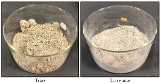 The pyrosis char is an inert material obtained from the pyrolysis of coal at a temperature of 850 °C and is incombustible. The chemical components of char include fixed carbon (80.05%), ash (12.93%), and moisture (7.02%). The char has a particle form with a black color and has a moisture content of 14%. The received char from the pyrolysis processing plant has 60% of the particles passing through a 300 μm sieve and the remaining 40% of particles passing through a 75 μm sieve. The received char is ground in a ball mill to obtain more than 80% of particles passing through a 300 μm sieve, and this ground char (named fine char) is used here for manufacturing paving blocks. Cement type I/II was used in manufacturing paving blocks. The other materials used in this project include an amorphous micronized grey silicon dioxide pozzolana known as SF and a light yellowish SP powder. The trass and trass-lime used for this study (Figure 1) have more than 99% of the particles passing through a 300 μm sieve. The trass is a brownish-grey pozzolanic material that consists mainly of aluminum oxide (Al2O3), silicon oxide (SiO2), calcium oxide (CaO), magnesium oxide (MgO), and alkalis (Na2O, K2O). The trass-lime used in this study (Otterbein trass-lime FL B 2) is a formulated lime according to EN459-1 and is whitish grey. It contains natural hydrated lime NHL 2 and trass powder according to DIN 51043 as a natural pozzolan.