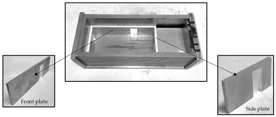 The 10 mm thick aluminum plates with indentations as shown in Figure 2 have dimensions of 193 × 55 mm (front plate) and 91 × 55 mm (side plate). These plates were placed inside the rectangular mold (254 × 102 × 102 mm) made of high-strength steel to give a unique design to the paving blocks. The indentation on the aluminum plates (two side plates and two front plates) has a base dimension of 25.4 × 7.6 mm and gradually tapers upwards up to a height of 38 mm.