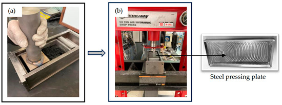 Stages in developing process of char-based paving block: (a) initial compaction with cylindrical hammer and (b) final compression using a hydraulic press.