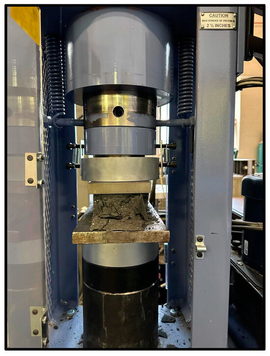 Laboratory testing was conducted to assess the characteristics of the produced paving blocks and measure their compressive strength, water absorption, freeze–thaw durability, and abrasion resistance as per ASTM C936 [34]. The measured properties were also validated against ASTM C1272 [2] to confirm their application in heavy vehicular traffic areas. For the compressive strength test, the sample of paving blocks was placed below the machine and loaded till failure as shown in Figure 5.