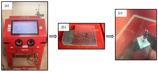 The abrasion index test was performed as per ASTM C418 [35]. The sandblasting cabinet used for the test is shown in Figure 6a. Before testing, the samples were submerged in water for 24 h. The saturated samples after 24 h were then made surface dry to obtain a saturated surface dry condition at the time of the test. The 1.2 mm thick shield made of a steel sheet with a circular hole of diameter 28.70 mm was positioned firmly over the specimen inside the sandblasting cabinet as shown in Figure 6b. Compressed air at 60 psi and abrasive material were injected onto eight sample surfaces for one minute on each spot as shown in Figure 6c. The abraded volume was measured, and the thickness loss was calculated by dividing the measured abraded volume by the sum of the cross-sectional area of all eight spots. The ASTM C936 [34] requires an average abrasion volume loss of 15 cm3/50 cm2, and ASTM C1272 [2] has a higher tolerance level up to 85 cm3/50 cm2.