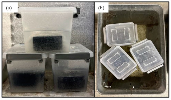 The freeze–thaw test on full-sized paving block samples was conducted in accordance with the ASTM C1645 [37]. The freeze–thaw test was carried out by submerging the paving block samples completely in 3% saline water. For each cycle, the sample was kept in a freezing chamber for 16 h (Figure 8a) and in a thawing chamber for 8 h (Figure 8b). The temperature during freezing was maintained at −15 ± 3 °C for the last seven to twelve hours, and during thawing a minimum of +5 °C was maintained for the last one hour. A total of 28 freeze–thaw cycles were conducted, and the average mass loss should be 225 g/m2 as per ASTM C936 [34].