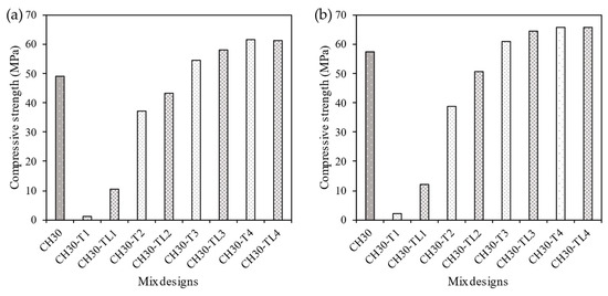Comparison of compressive strength of char-based paving blocks based on various mix designs: (a) 7-day test results and (b) 28-day test results.