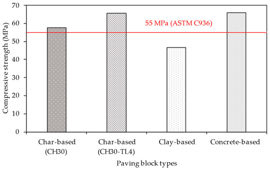 The comparison studies are carried out among various types of paving blocks to justify the strength adequacy of these char-based paving blocks. The compressive strength of commercial clay red pavers [41] carried in the lab measured at 46.6 MPa. Nandi et al. [23] used a particular mix composition for a control sample based on natural aggregates in their mix design, and the 28-day compressive strength was determined as 66 MPa, which is comparable to that of our char-based paving block CH30-TL4 as shown in Figure 11.