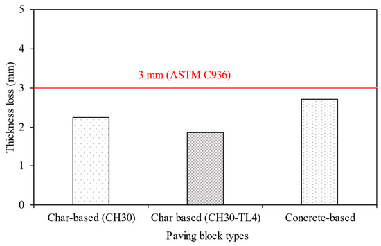 The average abraded volume for mix designs CH30 and CH30-TL4 per 50 cm2 surface area are 11.20 cm3 and 9.26 cm3. The average thickness loss resulting from the abrasion test of these paving blocks are 2.25 mm and 1.85 mm, respectively, as shown in Figure 12, which is within the permissible range of 3 mm as per ASTM C936 [34] and as per ASTM C1272 [2] for type R paving blocks. The comparatively higher abrasion resistance of char-based mix design CH30-TL4 can be attributed to several factors associated with trass-lime. Firstly, the addition of trass-lime facilitates the formation of additional hydration products leading to a denser and more compact matrix as evidenced by the compressive strength test results [15]. Secondly, the finer particle size distribution of trass-lime can alter the microstructure of the paving block resulting in a reduction in pore spaces [44]. This effect can contribute to reducing the ingress of sand abrasives when injected at high pressure to measure abrasion resistance, thereby improving the abrasive resistance of the paving blocks.