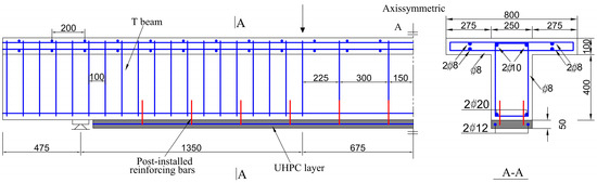 This research assessed the flexural performance of damaged T-beams strengthened with UHPC by designing 15 distinct T-beams based on the method by [40]. Table 2 displays the bending specimens’ specific parameters. The authors of [40] mention the bending specimens’ materials’ mechanical properties. Figure 2 displays the geometry of the specimen and the specifics of the reinforcement.