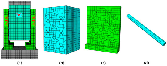 UHPC-RC finite element model and cell meshing. (a) Finite element model; (b) matrix concrete; (c) UHPC reinforcement layer; (d) shear-resistant steel bars.