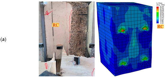 Comparison of failure modes between push-out tests and simulations (unit: MPa) (reproduced with permission from Ref. [35]. Copyright 2023 Elsevier). (a) Comparison of damage situation of RC matrix in the test piece and FE model. (b) Comparison of damage situation of shear-resistant steel bars in the test piece and FE model.