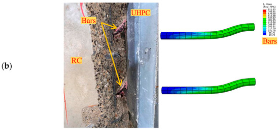 Figure 6 compares the simulation results of the FE model with the results of the push-out test. The FE model also experienced shear failure of the RC matrix, as shown in Figure 6a. Figure 6b shows that the installed reinforcement bar has changed shape fairly significantly. The outcomes demonstrate that, for the most part, the failure modes that the finite element model simulated agree with the test findings. The UHPC-RC rollout test’s failure mode and load transfer mechanism can be reliably studied using the finite element model. The UHPC-RC push-out test can be parametrically analyzed with the finite element model.