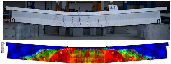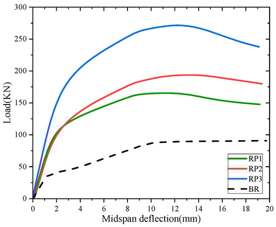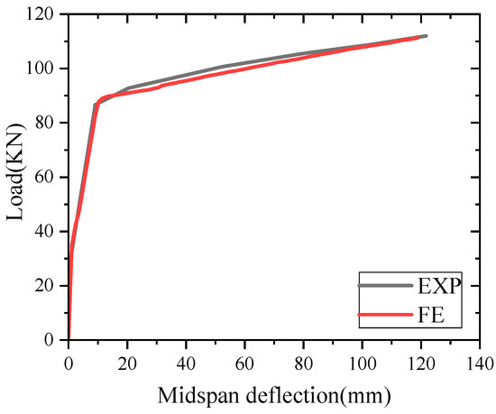 The comparison curves for load–midspan displacement between the finite element model and the test beam are displayed in Figure 7.