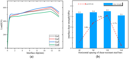 Results of horizontal spacing analysis of shear-resistant steel bars: (a) load–slip curves; (b) comparison of interface shear strengths.