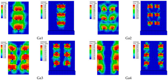 In Figure 10, the damage stress clouds of UHPC-RC specimens are shown when they are under a maximum load and have different horizontal spacing of shear-resistant steel bars. From Figure 10, it can be seen that for the Ga1 group, the inner concrete was gradually crushed under the load, and a small number of cracks appeared in the concrete on both sides, and too-small horizontal spacing of shear-resistant steel bars can easily cause local damage to the matrix concrete, resulting in a reduction in the specimen’s load-carrying capacity; the damage patterns of the Ga2–Ga3 groups were all interfacial slippage and concrete splitting, and the cracks appeared on the lower side of the concrete from the bottom to the top in the course of the loading process, and the bonding surfaces of the left and right sides of the specimen cracked after the damage, but they did not completely detach, with good bonding performance; the Ga4 group had bond damage in the steel bars at the early loading stage, and the left and right sides of the bond surface cracked when loading to the ultimate load, and relative slip occurred. The large horizontal spacing of shear-resistant steel bars cuts down the bond effect of steel bars, makes the UHPC layer and the concrete disengage, and leads to the failure of the shear-resistant steel bars.