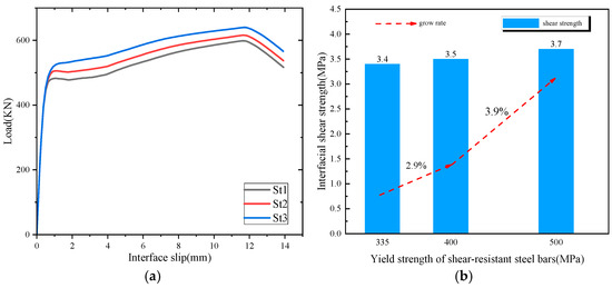 The yield strength of shear-resistant steel bars was chosen to be 335 MPa, 400 MPa, and 500 MPa, with no modifications made to the other parameters. The impact of the yield strength of shear-resistant steel bars on the load–slip curves and the interfacial shear strengths of the push-out simulated specimens are displayed in Figure 11. The increasing stage of the curve in Figure 11a indicates that the push-out simulated specimen can support an increasing amount of weight as the yield strength of shear-resistant steel bars increases from 335 MPa to 500 MPa.