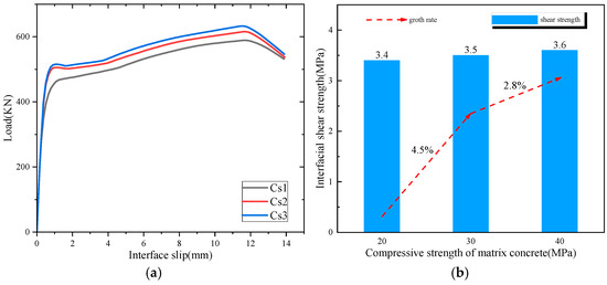 Results of compressive strength analysis of matrix concrete: (a) load–slip curve; (b) comparison of interfacial shear strengths.