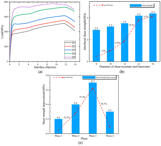 Other parameters stayed the same, and the diameters of the shear-resistant steel bars were chosen to be 8 mm, 10 mm, 12 mm, 14 mm, and 16 mm. The impact of the diameter of shear-resistant steel bars on the interfacial shear strength and the load–slip curves of the push-out simulated specimens are displayed in Figure 13. It is evident from Figure 13a that when the diameter of shear-resistant steel bars increases from 8 mm to 16 mm, the push-out simulated specimens’ ultimate load capacity progressively rises in the rising stage of the curve.
