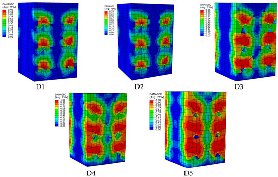 Damage stress cloud for specimens with different horizontal spacings of shear-resistant steel bars (unit: MPa).
