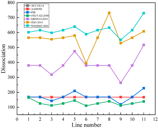 Figure 9b shows the effect of horizontal spacing of shear-resistant steel bars on interfacial shear strength. The interfacial shear strength increased with the increase in horizontal spacing of shear-resistant steel bars from 4d to 12d and showed a relatively large decrease when the horizontal spacing of shear-resistant steel bars was increased to 16d. The interfacial shear strength increased by 3.8% and 2.3% when the horizontal spacing of shear-resistant steel bars increased from 4d to 12d, respectively, and decreased by 11.7% when the horizontal spacing of shear-resistant steel bars increased from 12d to 16d.