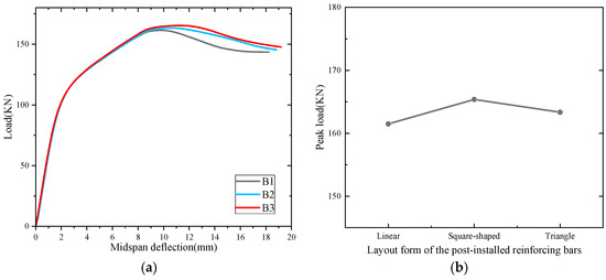 Results of the analysis of the layout form of the post-installed reinforcing bars: (a) load–deflection curve; (b) peak load comparison.