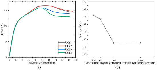 In this section, the longitudinal spacing of the post-installed reinforcing bars is selected as 150 mm, 300 mm, 600 mm, and 1200 mm, while other conditions remain constant. Figure 19 shows the effect of longitudinal spacing of the post-installed reinforcing bars on the load–deflection curves and peak load of UHPC-strengthened secondary stressed T-beam specimens. In Figure 19a, we can see that as the longitudinal spacing of the post-installed reinforcing bars grows from 150 mm to 1200 mm, and the ultimate load capacity of the UHPC-strengthened secondary stressed T-beam samples gradually decreases in the rising stage of the curve. The part of the load–deflection curves that goes down shows that the UHPC-strengthened secondary stressed T-beam samples will break quickly when the maximum load is reached. The curves of UGa1 and UGa2 tend to be parallel after the load reaches the ultimate load capacity, which indicates that the plastic deformation of these two samples is more pronounced. The curves of UGa3 and UGa4 decline faster after approaching the peak, which indicates that these two samples are more easily damaged.
