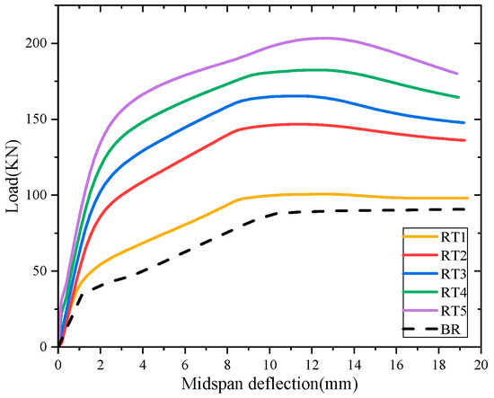 It can be seen that when the reinforcement location is located in a U-shaped reinforcement, the amplitude of load lifting is the greatest, but the material utilization rate is not high. The amplitude of load lifting of the two-side reinforcement is not significant compared to the bottom reinforcement, but it has the lowest material utilization rate. The bottom reinforcement has a more obvious load enhancement and the highest material utilization rate, which has the highest economic value in the actual project. As a result, it is recommended that the bottom reinforcement is the most appropriate location for economic and safety reasons.