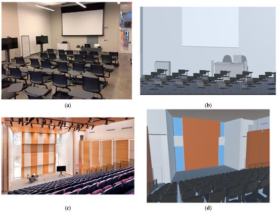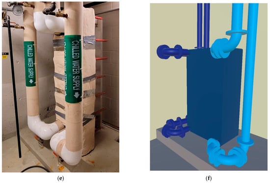 Illustration of physical and virtual spaces. (a) Photo of one study room studio (Studio C); (b) screenshot of virtual space of Studio C; (c) photo of the forum mezzanine in stadium seating; (d) screenshot of virtual space of the forum mezzanine; (e) photo of the plate heat exchanger in the mechanical room; (f) screenshot of the virtual plate heat exchanger space.