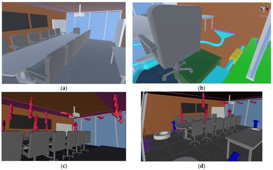 Screenshots of the virtual tour of the conference room. (a) Entrance view; (b) ductwork and fan coil; (c) heating mode; (d) cooling mode.