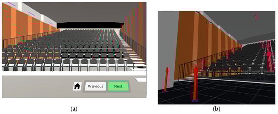 Figure 3 provides four screenshots illustrating the virtual tours of the forum mezzanine. In Figure 3a, users perceive the stadium seating upon entering. Three buttons (i.e., home, previous, and next) are positioned at the bottom for users to navigate different scenes of the virtual tours. Figure 3b depicts a heating mode condition with internal heat gains (indicated as wavy red arrows) from the seating area, while heating supply air is distributed from the floor diffusers. Figure 3c showcases the return air illustrated by an arrow (brown), along with wall-mounted return grilles and a return air duct (green) positioned at the top portion (close to the ceiling) of the room. The cooling mode concept in Figure 3d mirrors the heating mode, with supply air (blue arrows) intended for cooling. The virtual tour of the forum mezzanine lasts approximately 9 min without pausing by users. The corresponding lengths of the virtual tours of the study room studios and the mechanical room are 10 min and 11 min, respectively.