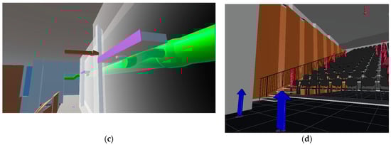 Additionally, some comments noted that the transparency feature (e.g., Figure 3c) helps participants visualize and relate “unseen” HVAC components in the building spaces. The presence of arrow annotations denoting various heating, cooling, and ventilation aspects proved helpful for understanding the functions of different air distribution and hydronic systems. This corresponds to developments of other researchers that utilize “unseen” elements in the real context to support learning such as showing AR arrows as loading and reaction forces in structural analysis [] and superimposing AR meshes of finite elements to illustrate stress distribution of a real object []. Furthermore, participants enjoyed the option to physically move around the virtual space while still maintaining a large field of view by walking and turning within their surrounding environments.