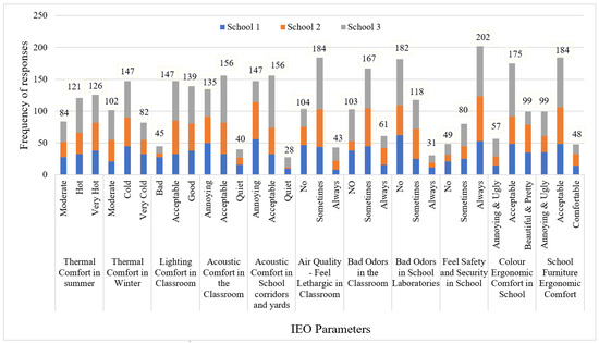 The survey conducted on IEQ in Palestinian classrooms highlighted several critical issues that significantly impact students’ learning and health. The primary concerns identified include inadequate thermal and acoustic comfort and poor air quality.