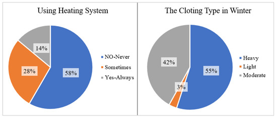 Based on students’ opinions in Figure 2 most (75%) of students found their classrooms uncomfortably hot and very hot in the summer. During winter, 69% of students expressed dissatisfaction with the classroom temperature, considering it cold or too cold. The reason for this is that these schools lack heating, cooling, and ventilation systems (HVAC). Therefore, students often resort to extra layers of clothing to deal with insufficient heating, as shown in Figure 2. In addition, 14% of schools have attempted to address this issue by installing electric heaters, as shown in Figure 3. However, this limited adoption highlights the ongoing challenge of consistently maintaining an appropriate temperature.