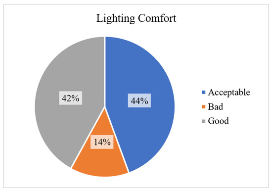 Lighting comfort had a high mean level, which means that many students expressed satisfaction with the lighting levels in their classrooms. As shown in Figure 4, 86% of students found the lighting satisfactory, indicating a positive reception. Palestinian public schools rely heavily on T8 or T5 fluorescent tubes. However, there is an apparent effort to replace these lamps with LED lamps because of their advantages in terms of energy and lighting. However, this replacement only depends on replacing the defective bulbs and not replacing all the bulbs, which makes the process slow. Overall, based on students’ opinions, it is clear that the lighting level in classrooms is sufficient.