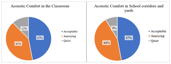 Acoustic comfort in educational settings is essential for students’ academic success and well-being. Students in noisy environments often have difficulties understanding speech, resulting in decreased comprehension and learning outcomes. For example, ref. [38] analyzed how noise affects students’ cognitive functions, which is related to students’ learning performance. Two hundred and sixty-eight students from three different primary schools in Ulsan, Korea, were included: 135 boys and 133 girls aged 10–12 years. The results showed that noise significantly affected global IQ scores, verbal IQ scores, Continuous Performance Test scores, Children’s Color Paths Test scores, and Stroop test scores. These results suggest that noise risks the attention and performance of elementary school students, especially for groups most at risk of poor academic achievement.
