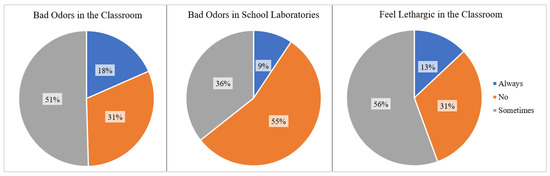 The presence of unpleasant odors was a notable concern in classrooms, with two-thirds of students reporting occasional to constant unpleasant smells, as illustrated in Figure 6. Additionally, 45% of students noticed similar odors in laboratories, emphasizing an urgent need to address odor issues comprehensively to foster a better learning environment. Moreover, a significant majority of students, over two-thirds, experienced lethargy in their classrooms, indicating elevated carbon dioxide levels due to inadequate ventilation. The deficient air quality in Palestine’s public schools primarily results from the absence of ventilation systems in individual classrooms. The air quality in the laboratories is slightly better than in the classrooms, but this is due to the lower occupancy rate and slightly increased ventilation. However, in winter, the lack of heating systems means that classroom windows are closed, interrupting natural circulation and exacerbating air quality problems.