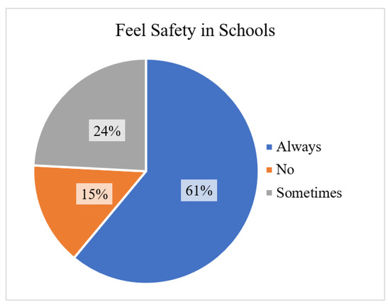 Students’ views on safety within the school environment varied, as shown in Figure 7. Most (over 60%) felt very safe due to clear security measures, including fences and gates surrounding most schools, creating a reassuring atmosphere. However, nearly a quarter of students expressed partial feelings of safety, which could be affected by various factors such as outdated infrastructure, inadequate security, inconsistent policies, or specific incidents involving unruly students. Significantly, perceptions of safety varied between schools, with some older institutions arousing discomfort.