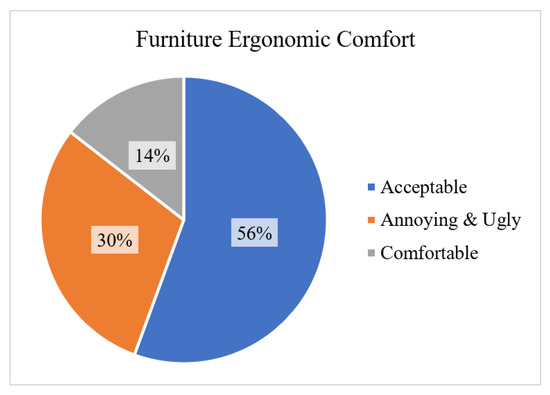 Examining the classroom furniture revealed that students had different opinions, as shown in Figure 9. More than 70% of participating students expressed satisfaction with the ergonomic features of the classroom furniture, finding it attractive and well-suited to their needs. Conversely, nearly 30% of students expressed dissatisfaction, citing concerns regarding comfort and aesthetics. While some students found the chairs uncomfortable, others found them unattractive. An important factor contributing to these negative ratings was irregular maintenance in some educational institutions. When essential maintenance is overlooked, the quality and usability of the furniture deteriorate, affecting the overall beauty of the learning environment. Moreover, financial constraints often hinder furniture replacement, resulting in students experiencing prolonged discomfort due to the wear and tear of old furniture.